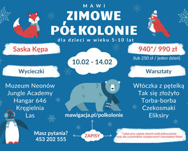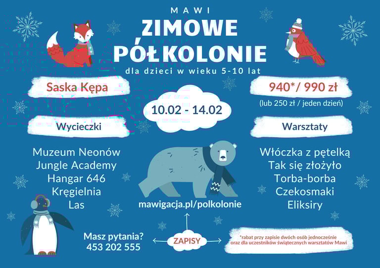 Na półkolonie zapraszamy dzieci od 5 do 10 roku życia, jednak jeżeli Twoje dziecko jest starsze, skontaktuj się z nami - jeżeli spodobały się Wam propozycje wycieczek, jesteśmy w stanie dostosować program do uczestnika w każdym wieku.